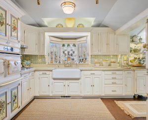 The chef’s kitchen is a showpiece of artisanal design, where leathered limestone marble countertops meet handcrafted tilework and sculptural brass hardware. Each element was thoughtfully selected to balance function with artistic expression, creating a space equally suited for intimate family gatherings or elegant entertaining.